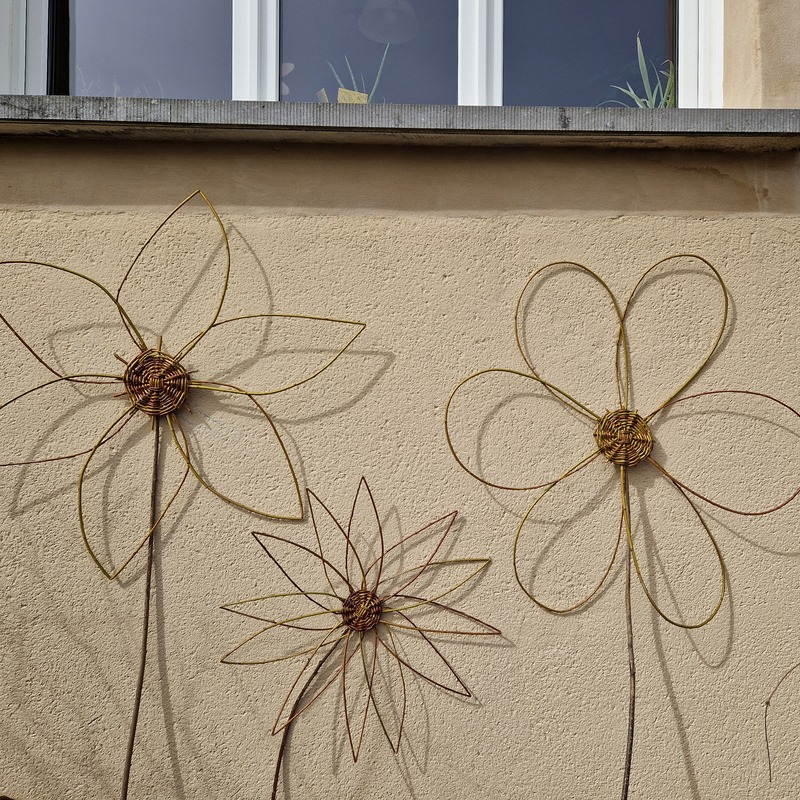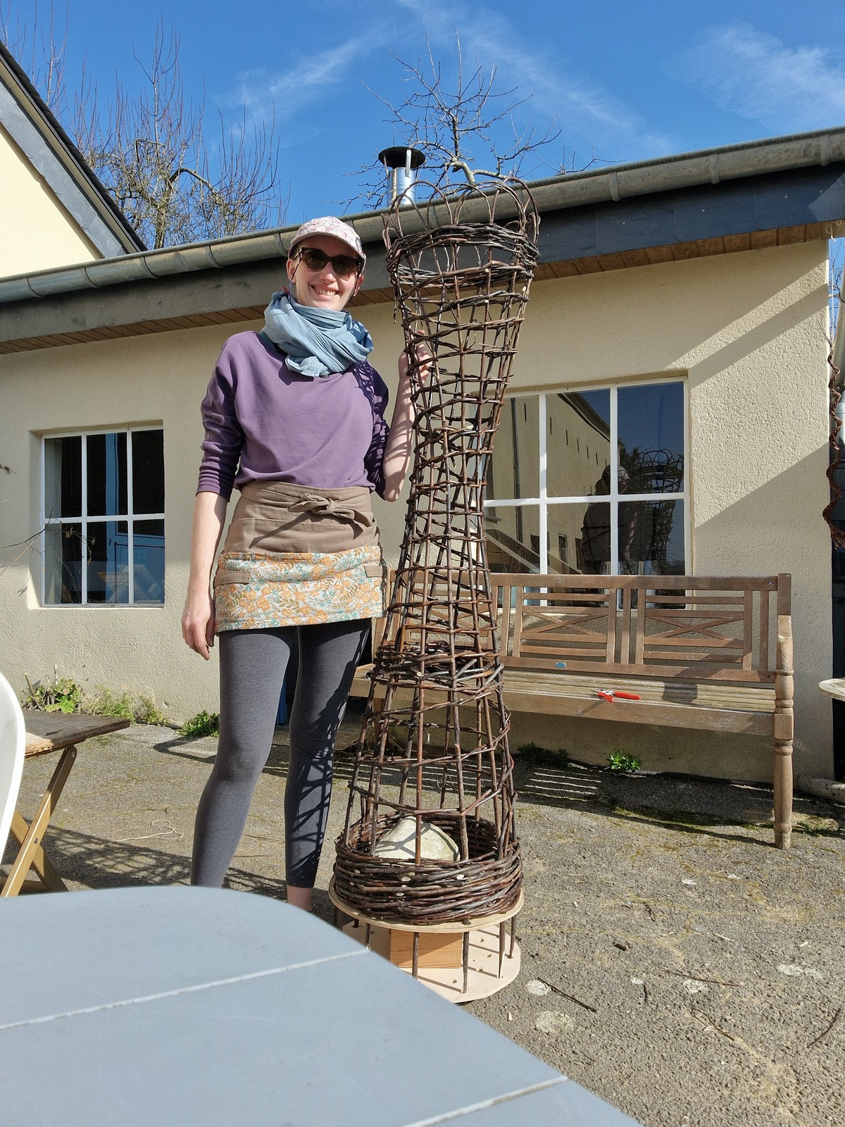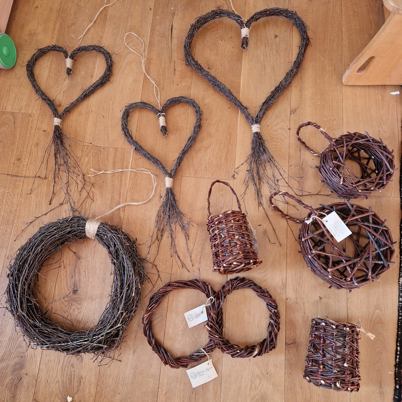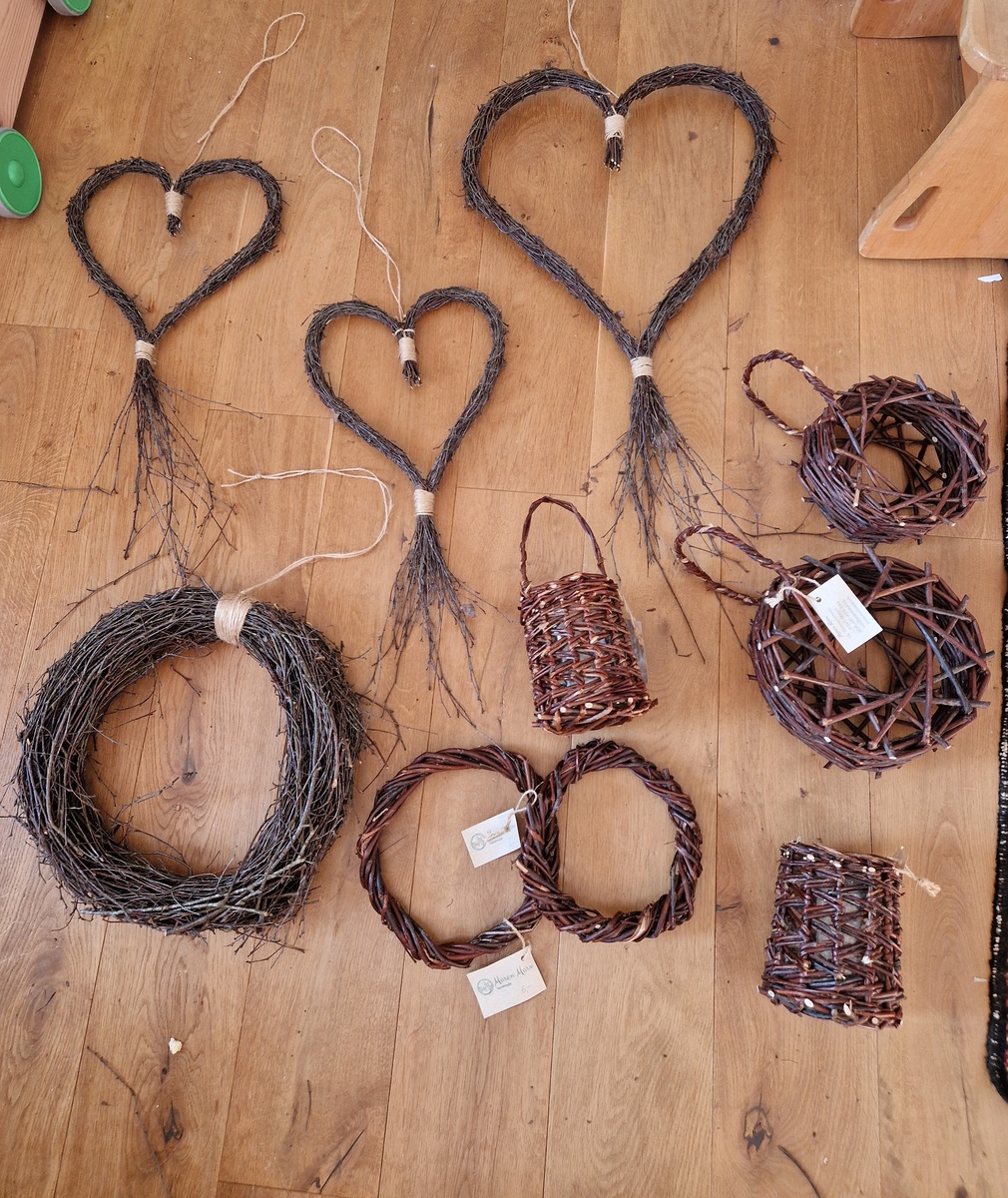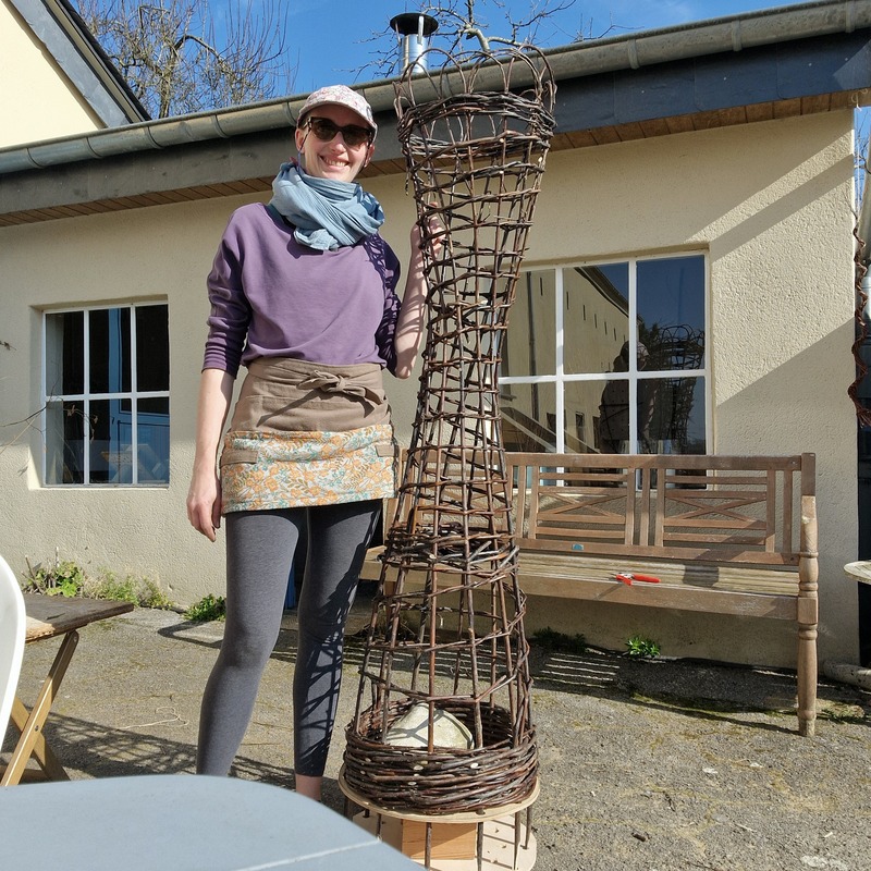 Die verflochtenen Weiden stammen von alten Kopfweiden aus der Region. Im Winter geerntet, getrocknet, gelagert und mittels einweichen zum Flechten vorbereitet.
