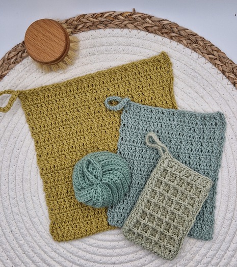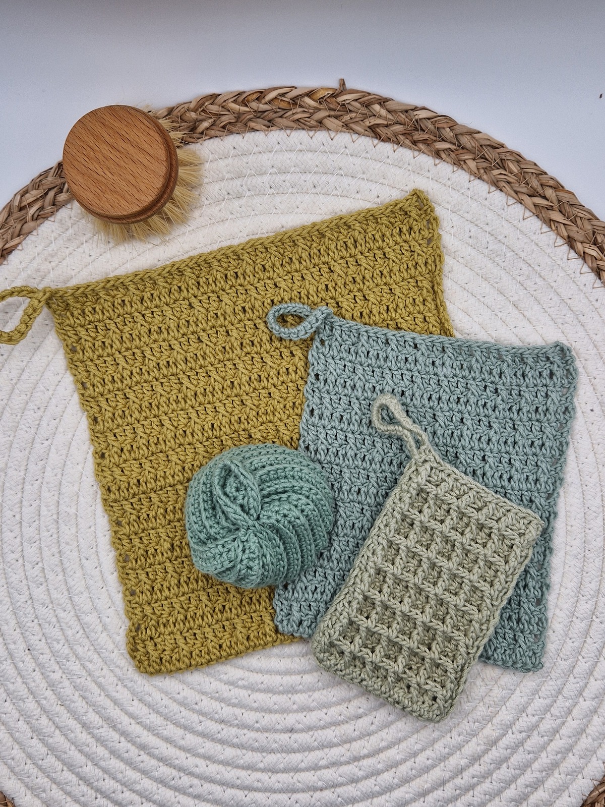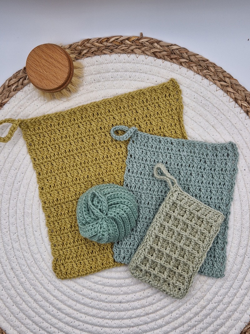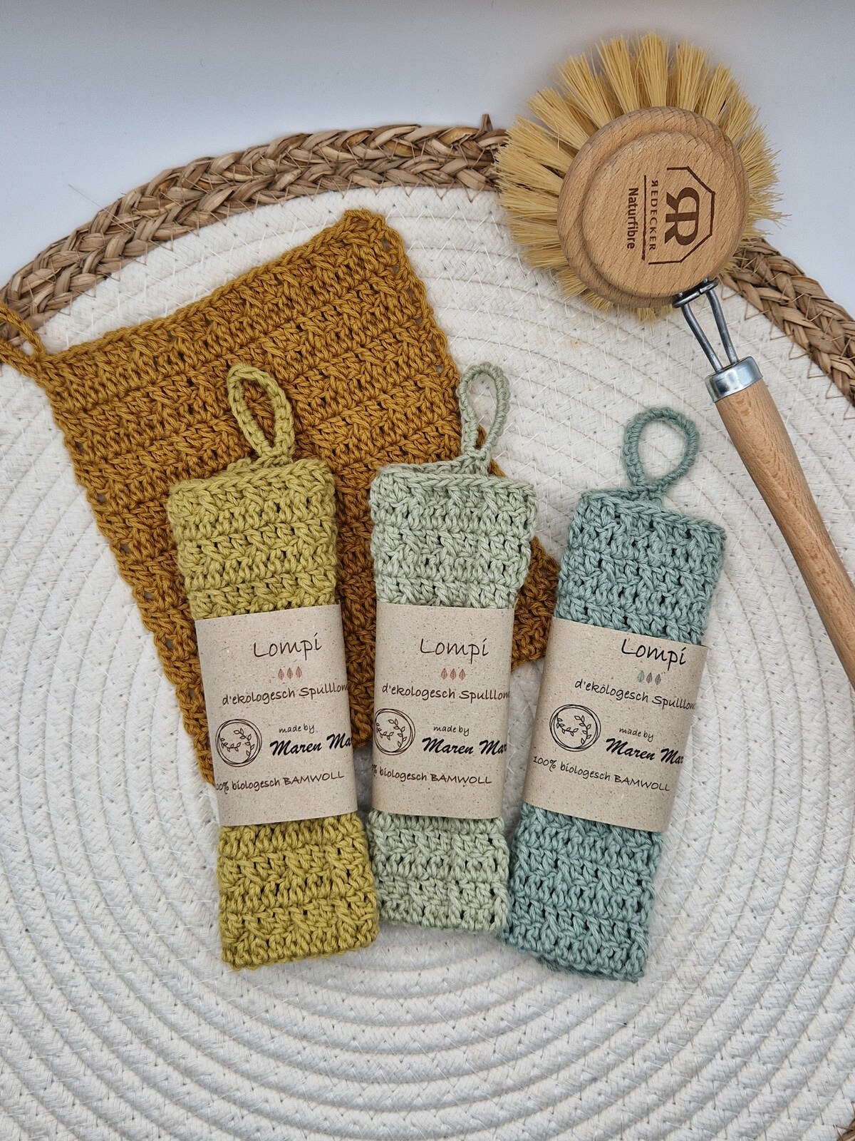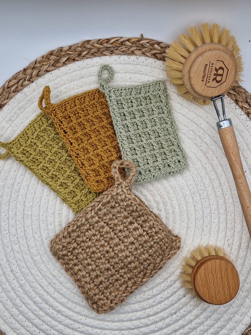Meine gehäkelten Spülaccessoires aus zertifizierter BIO Baumwolle und natürlicher Jute sind immer wieder verwendbar, waschbar und fair gehandelt. So wird auch dein Abwasch noch grüner.